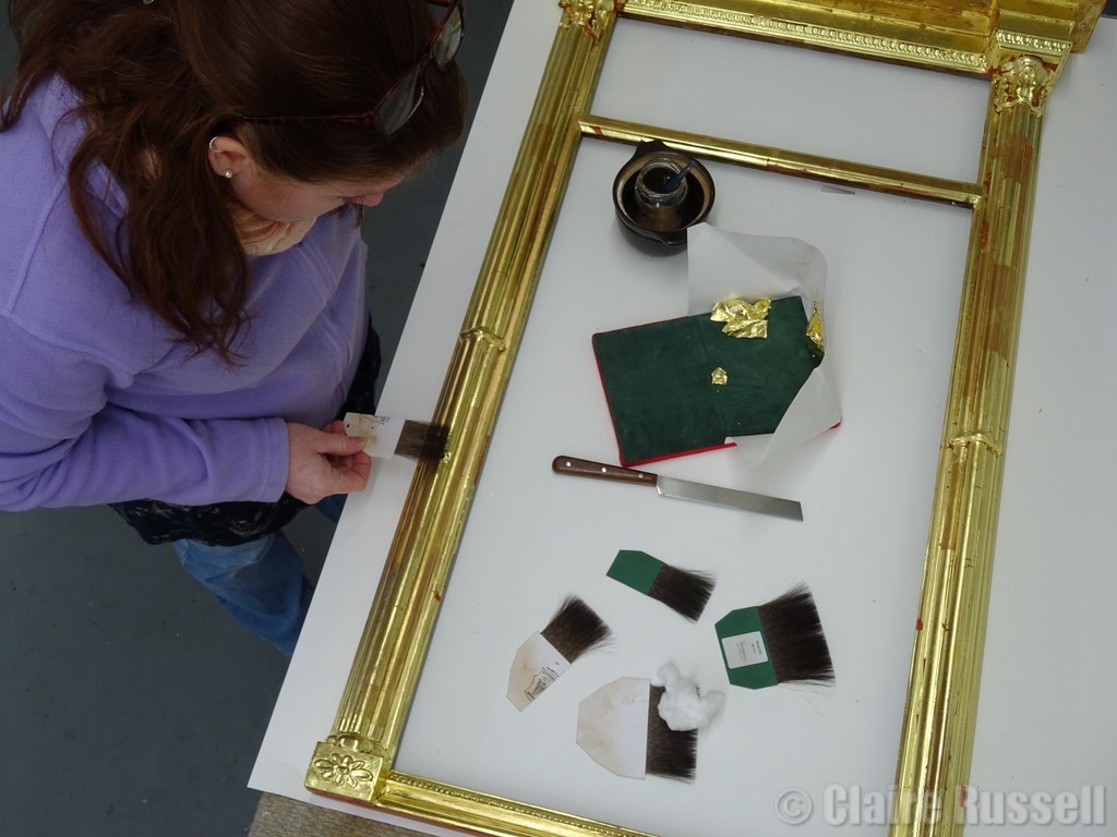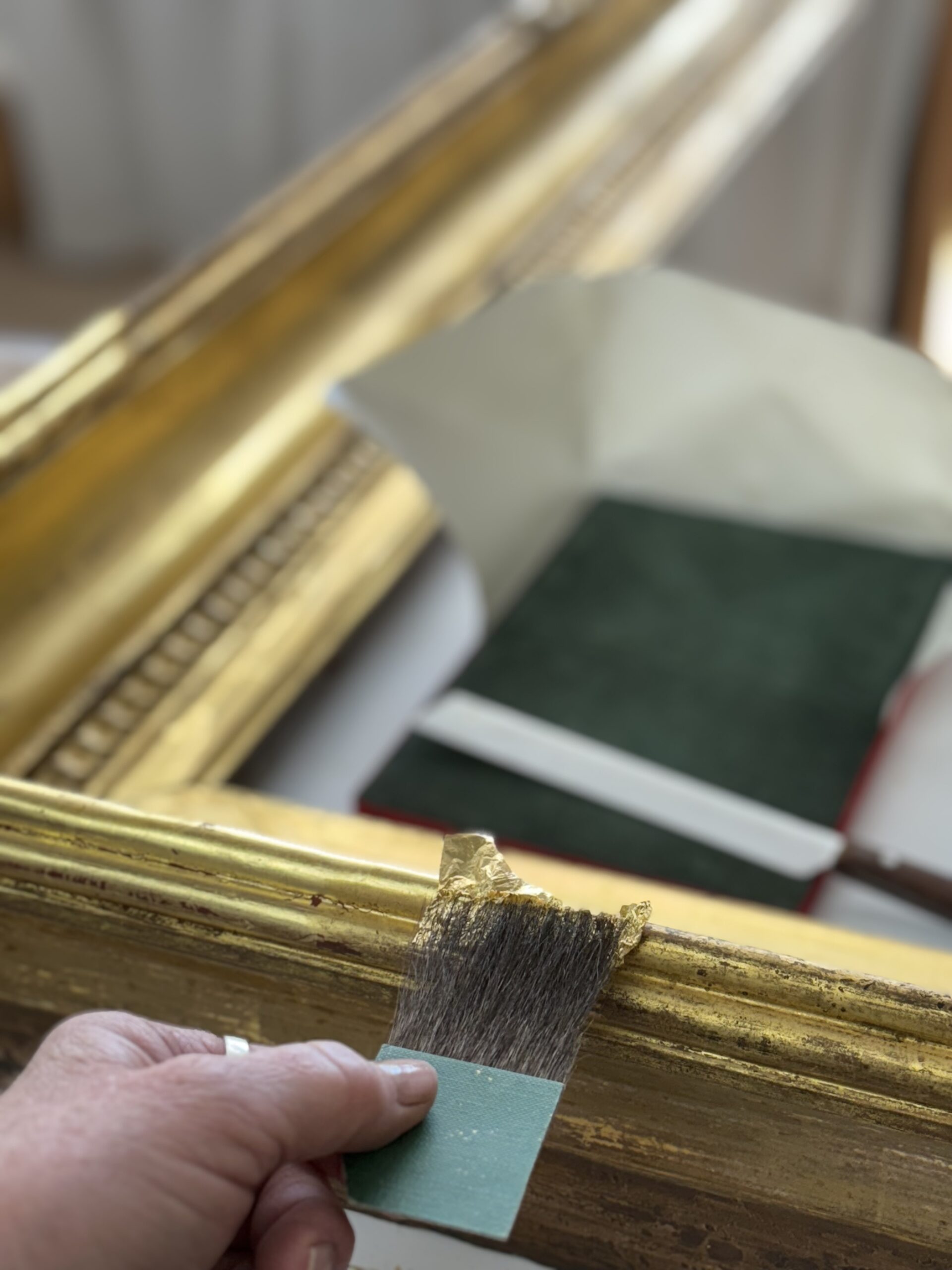 23ct gold leaf is used to restore antique frames, which is aged to blend in with the frames original patina.